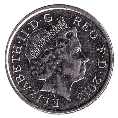 This British five pence piece depicts Elizabeth II. The words ‘ELIZABETH II D G REG F D’ are inscripted on the nickel plated steel 5p coin”. It is the smallest British coin in use today.