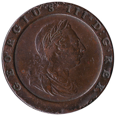 The Royal Mint issued British Pound coins in 16 different denominations, including this British cartwheel penny. They are part of the predecimal and withdrawn Pound Sterling coins series. The Royal Mint started issuing these 0.004167 British Pound coins in 1797. They were withdrawn from circulation in 1825.