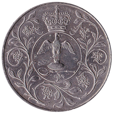 The Royal Mint issued British Pound coins in 16 different denominations, including this British Crown coin Queen Elizabeth II Silver Jubilee (1977). They are part of the predecimal and withdrawn Pound Sterling coins series. The Royal Mint started issuing these 0.25 British Pound coins in 1977. They were withdrawn from circulation in 1977.