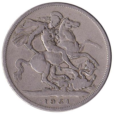 This commemorative crown coin with a value of five shillings was minted to celebrate the Festival of Britain in 1951. On the obverse side is the portrait of King George VI. The back side shows the Roman soldier Saint George, mounted on a horse, slaying the dragon.