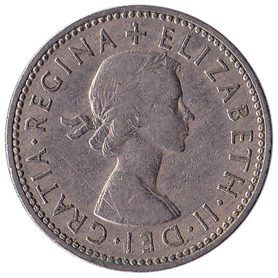 - Text: DEI GRATIA REGINA, Elizabeth II, FID DEF, One Shilling