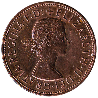 - Text: DEI GRATIA REGINA F D, Elizabeth II, One Penny