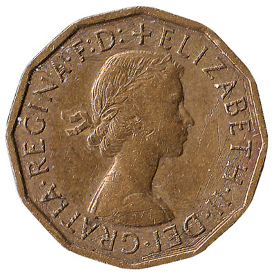 - Text: DEI GRATIA REGINA F D, Elizabeth II, THREE PENCE