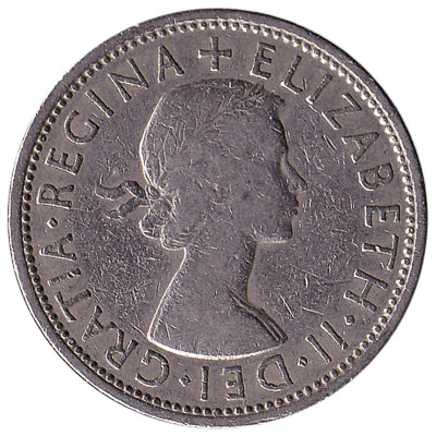 The coin of two shillings is also known as a ‘florin’ or a ‘two-bob bit’. This cupronickel coin has the same value as a modern 10p coin: It is the equivalent of 1/10 of a Pound Sterling. The two shillings piece has multiple designs, featuring either a floral design or a lion. On the reverse side of the predecimal British florin coin is the portrait of the Monarch (King George VI or Queen Elizabeth II).