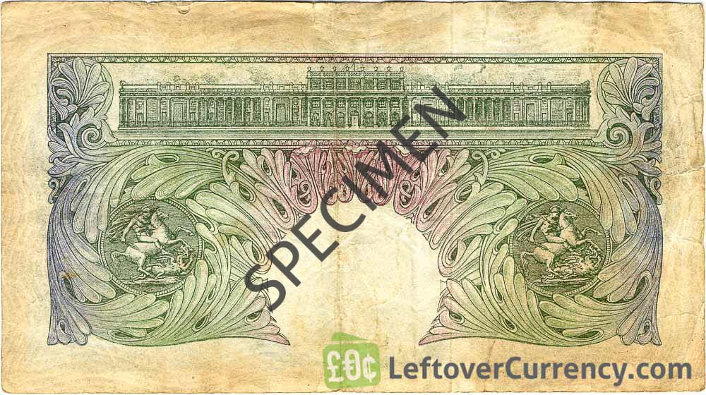 The Bank of England issued British Pound banknotes in 7 different denominations, including this Bank of England 1 Pound Sterling banknote (Britannia type green). They are part of the withdrawn Bank of England banknotes series. The Bank of England started issuing these 1 British Pound banknotes in 1928. They were withdrawn from circulation in 1962.