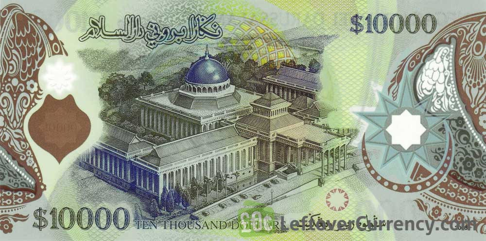 The Monetary Authority of Brunei Darussalam issued Brunei Dollar banknotes in 11 different denominations, including this 10000 Brunei Dollars banknote (Legslative Council building). They are part of the current Brunei Dollar banknotes series. The Monetary Authority of Brunei Darussalam started issuing these 10000 Brunei Dollar banknotes in 2006. They are currently still in circulation.