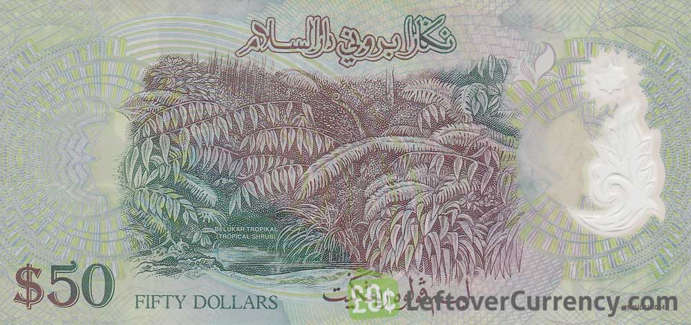 - Text: 50, 50 Dollars, Fifty Dollars, Lima Puloh Ringgit, Negara Brunei Darussalam