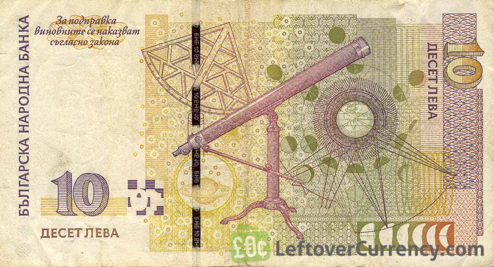 The banknote of 10 Leva from Bulgaria has a portrait of Bulgarian astronomor Petar Beron on the obverse side. The reverse side of the 10 BNG bill features astronomical sketches and instruments, including a telescope. The olive-brown-green coloured banknote has a holographic security strip on the front left side, which shows planet Jupiter and its rings.