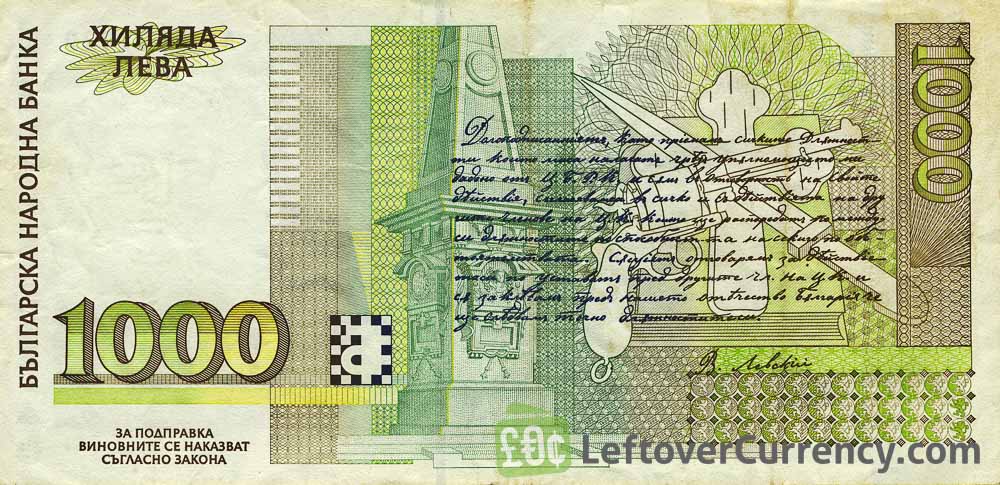 The Bulgarian revolutionary Vasil Levski is featured on the banknote of 1000 old Bulgarian Leva. The note has a hologram security strip. Other elements on the 1000 Leva banknote are the Liberty monument, a flag, sword and lion.