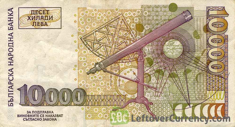 The old 10,000 Bulgarian Leva banknote has a similar design to the modern 10 new Bulgarian Leva banknote, to which it is equivalent in value. Both banknotes feature Doctor Petar Beron, Bulgarian educator, a whale and rhino.