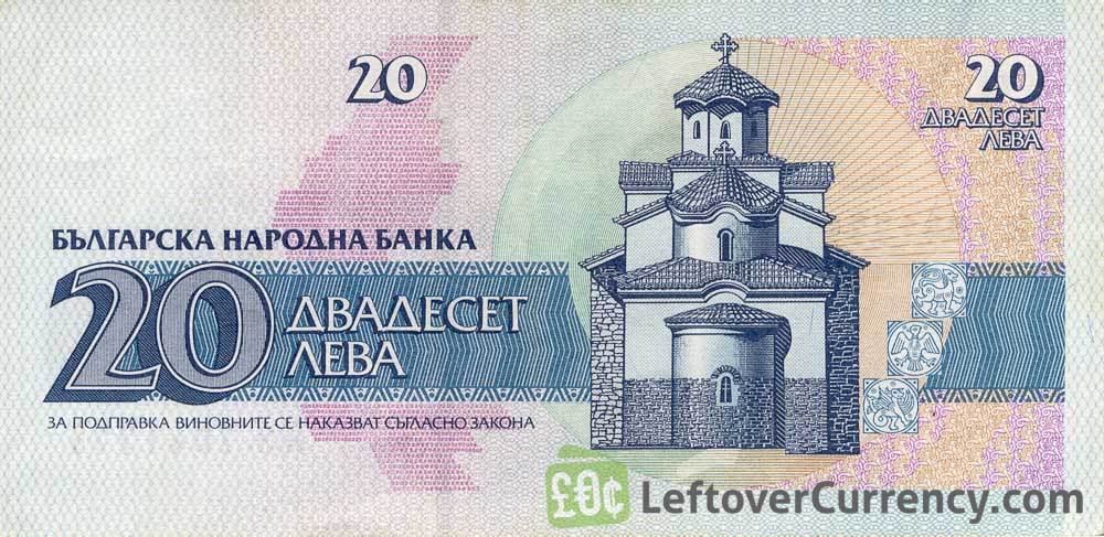 The Bulgarian National Bank issued Bulgarian Lev banknotes in 17 different denominations, including this 20 old Leva banknote Bulgaria. They are part of the withdrawn Bulgarian Old Lev banknotes series. The Bulgarian National Bank started issuing these 20 Bulgarian Lev banknotes in 1991. They were withdrawn from circulation in 1999.