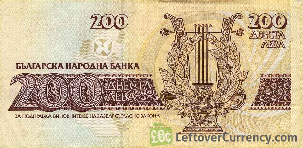 The Bulgarian National Bank issued Bulgarian Lev banknotes in 17 different denominations, including this 200 old Leva banknote Bulgaria. They are part of the withdrawn Bulgarian Old Lev banknotes series. The Bulgarian National Bank started issuing these 200 Bulgarian Lev banknotes in 1992. They were withdrawn from circulation in 1999.