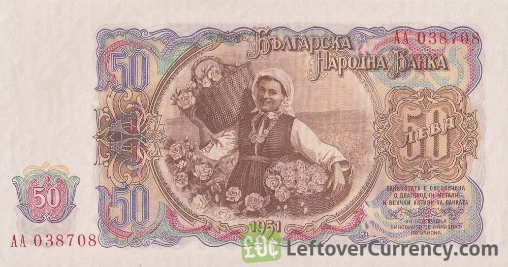 This banknote of 50 old Bulgarian Leva is dated 1951 and features the portrait of Georgi Dimitrov Mikhaylov, Bulgaria’s first communist head of state. On the back side is an image of an woman with a basket of roses.