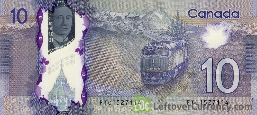 The $10 Canadian dollar bill of the Frontier Series has a portrait of John A. Macdonald, Canada’s first Prime Minister, on the obverse side. The reverse side of the violet colored polymer plastic ten CAD banknote features the passenger train ‘Canadian’ and mountains, the Canadian Rockies.