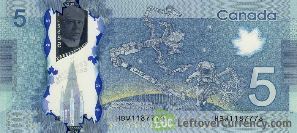 The $5 Canadian dollar bill of the Frontier Series features a portrait of Wilfrid Laurier, Prime Minister of Canada on the front side. The blue-colored polymer plastic notes features the robot arm ‘Canadarm2’ and an astranout on the back side.