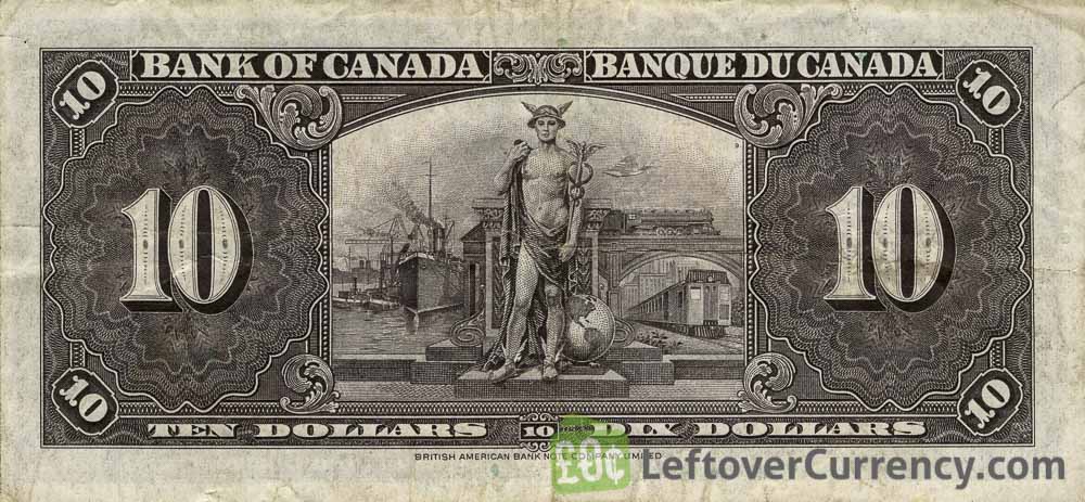 The Bank of Canada issued Canadian Dollar banknotes in 12 different denominations, including this 10 Canadian Dollars banknote series 1937. They are part of the withdrawn Canadian Dollar banknotes series. The Bank of Canada started issuing these 10 Canadian Dollar banknotes in 1937. They were withdrawn from circulation in 1954.