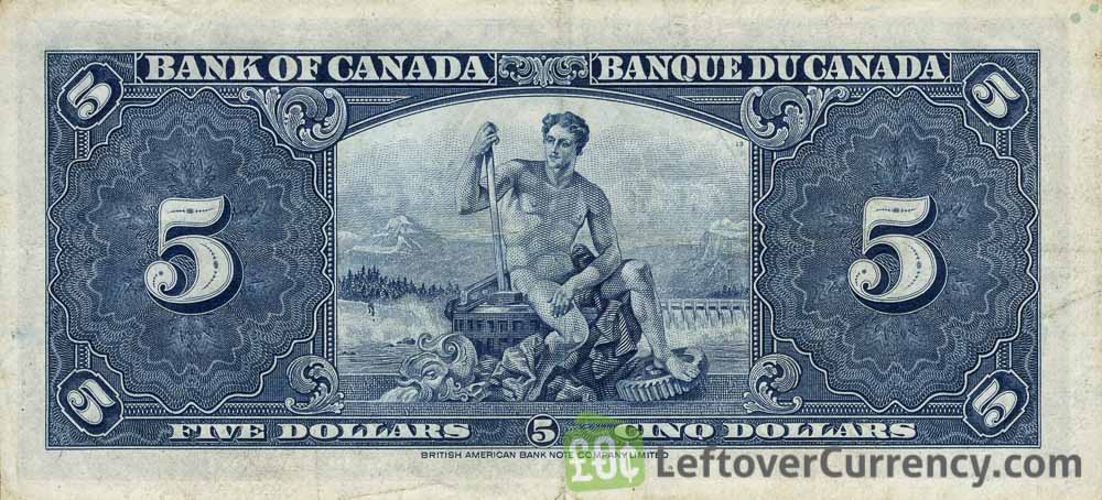 The Bank of Canada issued Canadian Dollar banknotes in 12 different denominations, including this 5 Canadian Dollars banknote series 1937. They are part of the withdrawn Canadian Dollar banknotes series. The Bank of Canada started issuing these 5 Canadian Dollar banknotes in 1937. They were withdrawn from circulation in 1954.