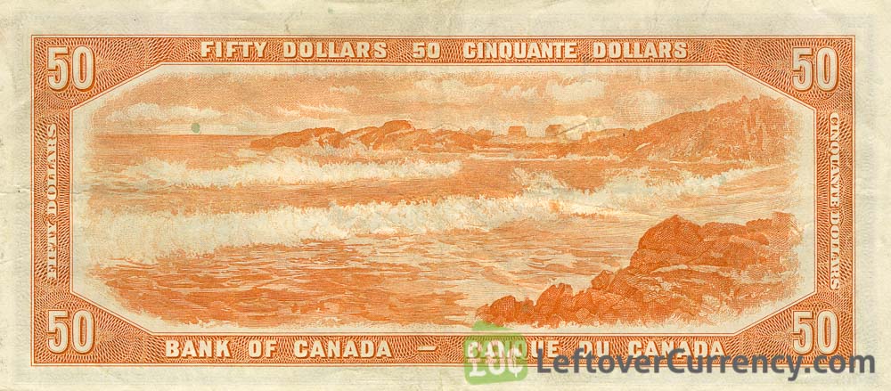The Bank of Canada issued Canadian Dollar banknotes in 12 different denominations, including this 50 Canadian Dollars banknote series 1954. They are part of the withdrawn Canadian Dollar banknotes series. The Bank of Canada started issuing these 50 Canadian Dollar banknotes in 1954. They were withdrawn from circulation in 1989.
