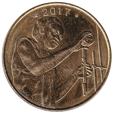 Similar to all FCFA coins, the 25 francs coin from West Africa shows the sawfish shaped gold weight of the Akan people, wrongly described by some as a tribal mask. The reverse side of the 25 francs piece has two versions: The commemorative coin issued since 1980 shows a female laborant pouring liquid in a test tube. The standard coin issued since 1970 shows the head of an oryx with farm crops including wheat and corn.