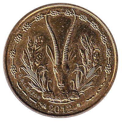 A sawfish-shaped tribal gold weight by the Akan people is shown on the obverse side of this 5 FCFA coin, in between the ‘5’ and the ‘F’. The reverse side of the five West African francs piece shows the head of an oryx, a type of gazelle, and farm crops including coffee beans, corn and sorghum cereals.