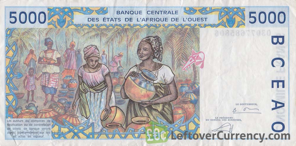 On the front side of the 5000 CFA francs note is a West African woman wearing a traditional headdress made of beads and shells. In the background is a factory. On the reverse side of the 5000 CFA francs bill are people on a market buying and selling pottery.