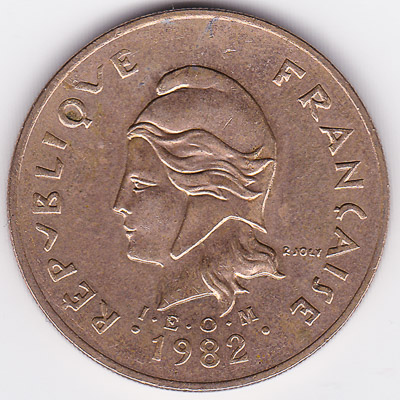The aluminium-bronze coin of 100 francs from French Polynesia shows Marianne, symbol of France, with a capped head. On the other side is a view on Moorea Harbour.