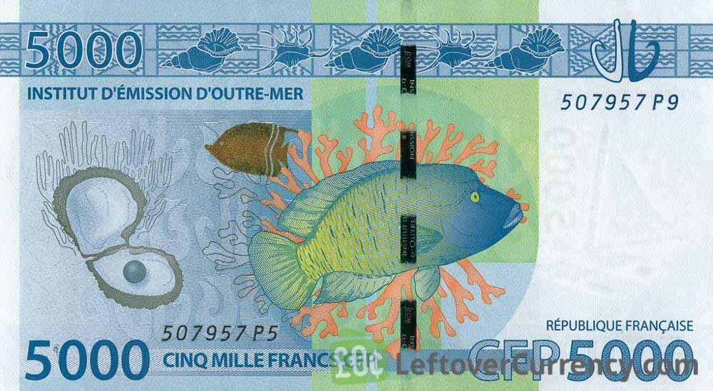 The blue coloured banknote of 5000 CFP francs features marine life of the French overseas collectivities of French Polynesia, New Caledonia, Wallis and Futuna. The fish on the ₣5000 francs bill include pennant coralfish, a humphead wrasse and an oyster with pearl.