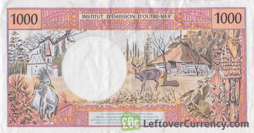 On the 1000 CFP francs banknote is an image of a Polynesian girl with tiare flowers in her hair and around her neck. In the background is a polynesian hutt with thatched roof underneath palm trees. On the back side is a village scene with deer and exotic birds.