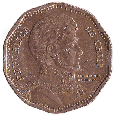 The Chilean 50 Pesos coin is made from aluminium bronze. When uncirculated or in good condition, they have a bronze colour to them, but older and more handled coins become darker and more copper-like in colour. They feature a portrait of Bernardo O’Higgins, one of the revolutionary leaders in the Chilean War of Independence who became the Supreme Director of the newly independent state of Chile in 1817.