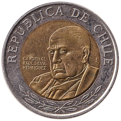 The bi-metallic $500 Chilean Pesos piece is Chile’s highest value coin. The gold coloured centre is aluminium-bronze, and the silver outer ring copper-nickel-zinc. It features a portrait of Cardinal Raúl Silva Henríquez, who was the Archbishop of Santiago from 1961 until 1983.