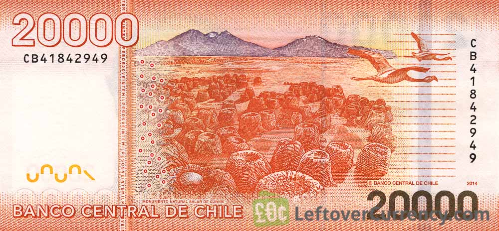 Chile’s highest value banknote of $20,000 pesos features Andrés Bello, philosopher and diplomat, on the front side. The back side shows the small salt lakes and salt flats of the Monumento Natural de Surire in the Andes.