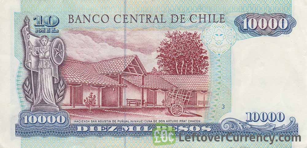 The Banco Central de Chile issued Chilean Peso banknotes in 11 different denominations, including this 10000 Chilean Pesos banknote (type 1989 to 2008). They are part of the withdrawn Chilean Peso banknotes series. The Banco Central de Chile started issuing these 10000 Chilean Peso banknotes in 1989. They were withdrawn from circulation in 2008.