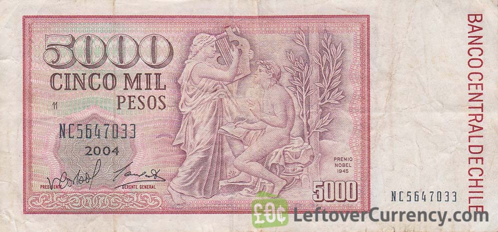 The old 5,000 Chilean Pesos note is fondly known as a ‘gabriela’. It has a portrait of the Chilean writer and educator Lucila Godoy Alcayaga, who was better known by her nom de plume Gabriela Mistral. Mistral was awarded the Nobel Prize for Literature in 1945, becoming the first Latin American writer to achieve this acolade. The scene on the reverse of the banknote, of a female figure playing the lyre as a male looks up from his writing, is taken from the design on the gold medal awarded to recipients of the Nobel Literature prize.