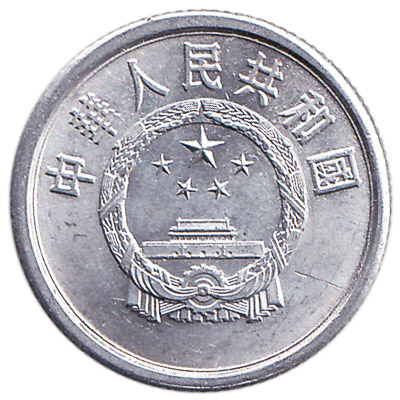The coin of 1 Chinese Fen weighs very little: less than 1 gram. One Fen is 1/100 of a Renminbi. Therefore the 1 Fen coin is the equivalent of one hundredth of a Yuan. The aluminium coin features a wreath and the national emblem of China.