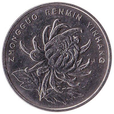 This newer version of the 1 Chinese Yuan Renminbi coin features a chrysanthemum flower. The nickel plated steel 1 Yi Yuan coin weighs 6.10 grams and measures 25mm across.