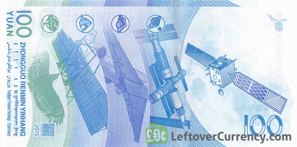 The People's Bank of China issued Chinese Yuan banknotes in 7 different denominations, including this 100 Chinese Yuan commemorative banknote (2015 China Spacecraft). They are part of the Chinese Yuan current Renminbi banknotes series. The People's Bank of China started issuing these 100 Chinese Yuan banknotes in 2015. They are currently still in circulation.