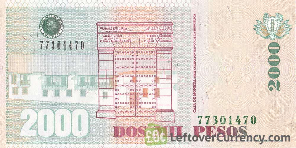 The banknote of $2000 Colombian pesos shows the portrait of Francisco de Paula Santander, 19th century military leader, on the front side. The back side shows the door of the Casa de la Moneda, the Colombian Mint, in Colombia’s capital city Bogotá.