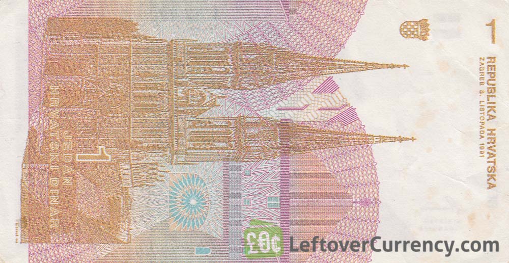 The banknote of 1 Croatian Dinar features the portrait of astronomer Roger Joseph Boscovich. On the back side of the Jedan Hrvatski Dinar bill is an image of Zagreb Cathedral and Stone Gate in the Upper Town of Zagreb. The 1 dinar banknote was the smallest unit of payment in Croatia in 1991: Croatian Dinar coins were not produced.
