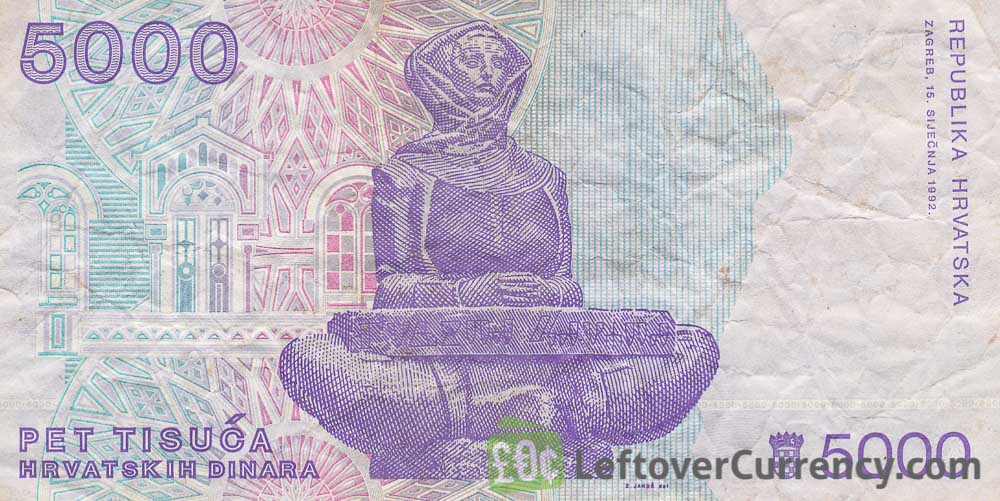 Povijest Hrvata, the statue sculpted by Croatian artist Ivan Meštrović, is featured on the back side of the 5000 Dinara banknote. The portrait on the front of the Pet Tisuca Hrvatskih Dinara bill is that of scientist and priest Ruder Boskovic, precursor of the Atomic theory.