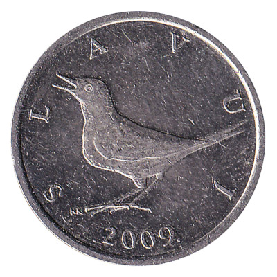 This 1 kuna piece has a diameter of 22.5mm and a weight of 5 grams. Text on the copper-nickel-zinc coin reads ‘Republika Hrvatska – Luscinia Megarhynchos’.