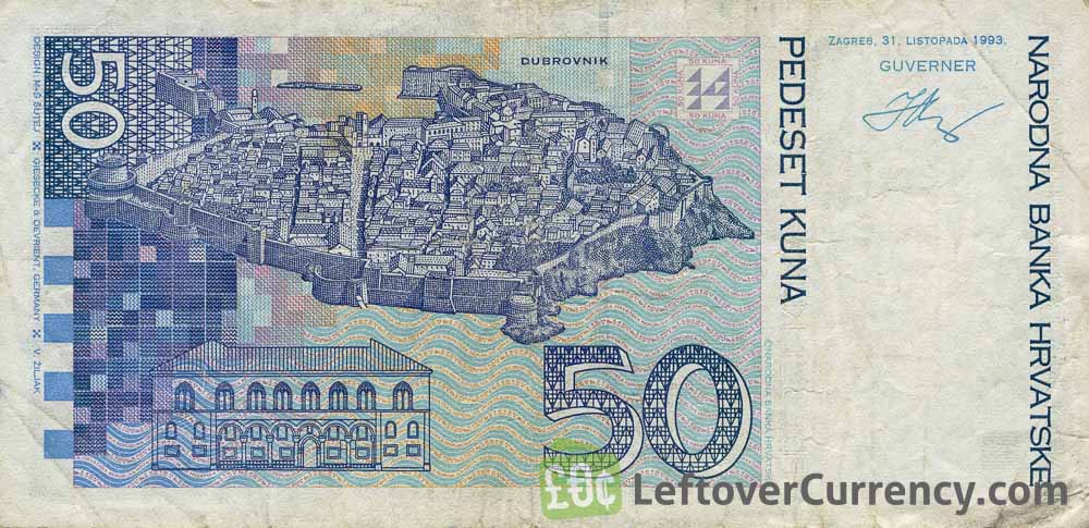 The Croatian National Bank issued Croatian Kuna banknotes in 9 different denominations, including this 50 Croatian Kuna banknote series 1993. They are part of the Croatian Kuna banknotes series. The Croatian National Bank started issuing these 50 Croatian Kuna banknotes in 1993. They were withdrawn from circulation in 2010.