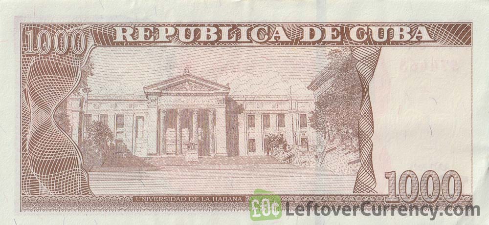 On the front of this 1000 Cuban Pesos banknote is a portrait of Julio Antonio Mella McPartland, a Cuban political activist and one of the founders of the original Communist Party of Cuba. Turn over this Mil Pesos bill, and you’ll see the University of Havana school building. Established in 1728, it’s one of the oldest and most prestigious educational institutions in Cuba.