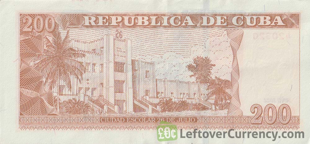 Franc Pais, a Cuban revolutionary who campaigned for the overthrow of General Fulgencio Batista’s government in Cuba, is depicted on the front of this 200 Cuban Pesos banknote. Turn this Doscientos Pesos bill over, and you’ll see the Ciudad Escolar 26 de Julio, previously known as Cuartel Moncada. This is a historic site in Cuba, famous for its connection to the Cuban Revolution.