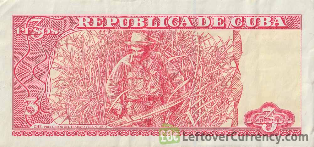The Central Bank of Cuba issued Cuban Peso banknotes in 11 different denominations, including this 3 Cuban Pesos banknote (Ernesto 'Che' Guevara). They are part of the current Cuban Pesos banknotes series. The Central Bank of Cuba started issuing these 3 Cuban Peso banknotes in 2004. They are currently still in circulation.