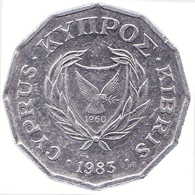 The Central Bank of Cyprus issued Cypriot Pound coins in 7 different denominations, including this 1/2 cent coin Cyprus. They are part of the Cypriot Pound coins series. The Central Bank of Cyprus started issuing these 0.005 Cypriot Pound coins in 1983. They were withdrawn from circulation in 2008.