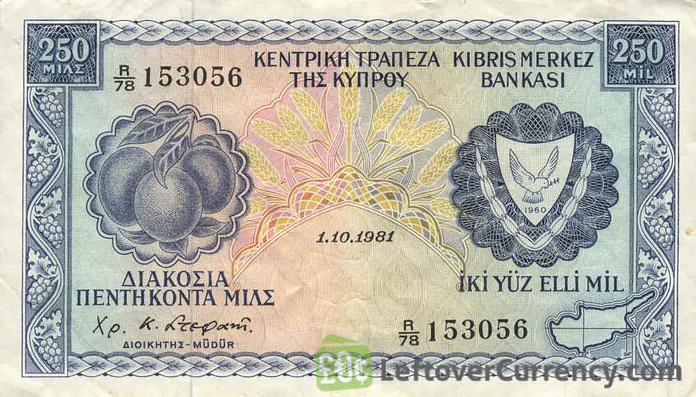 The Central Bank of Cyprus issued Cypriot Pound banknotes in 7 different denominations, including this 250 Mil banknote Cyprus. They are part of the Cypriot Pound banknotes series. The Central Bank of Cyprus started issuing these 0.25 Cypriot Pound banknotes in 1964. They were withdrawn from circulation in 1982.