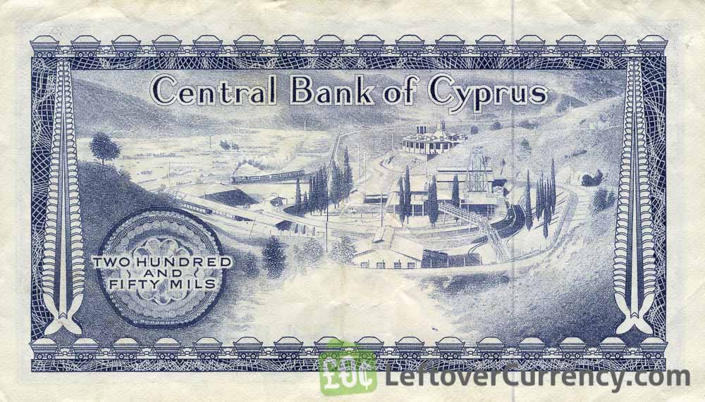 250 Mil is the equivalent of 0.25 Cypriot pounds. On the front of the 250 mils banknote is the Cypriot coaf of arms, showing a dove with an olive branch. The back side of the £0.25 CYP banknote features a coal mine with minecarts and a train.