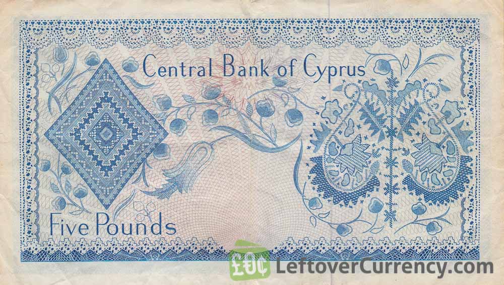The Central Bank of Cyprus issued Cypriot Pound banknotes in 7 different denominations, including this 5 Cypriot Pound banknote (Embroidery and Florals). They are part of the Cypriot Pound banknotes series. The Central Bank of Cyprus started issuing these 5 Cypriot Pound banknotes in 1966. They were withdrawn from circulation in 1976.