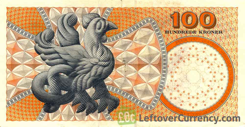 This 100 hundrede kroner banknote depicts the image of Carl Nielsen, Danish musician. The orange colored paper note contains the words ‘Danmarks nationalbank’. 100 Danish Krone notes like these have a diamond symbol in the top left corner.
