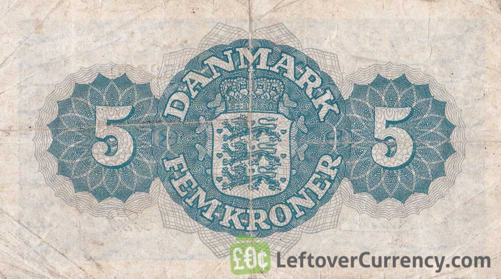 Printed on the 5 Danish Kroner bill is the text ‘KRO5NER’. This type of blue 5 DKK banknotes were used during and shortly after Word War II.